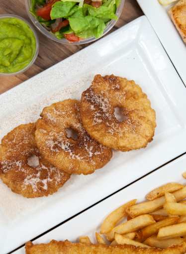2 servings of Fish, 4 x Prawns, 10 x Calamari, Medium Chips.
